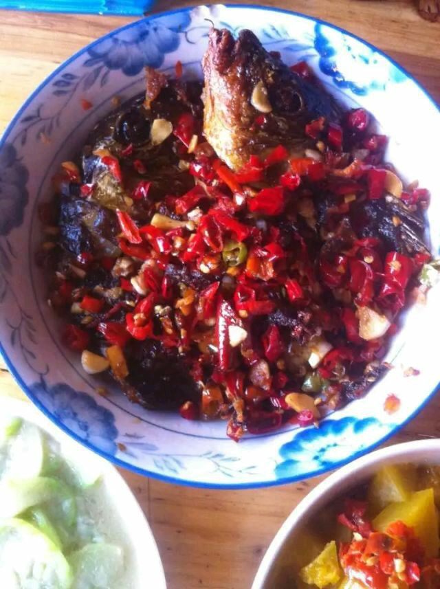 3:就着炸鱼的油下辣椒,蒜末,豆鼓,少盐,味精,鸡精,陈醋,酱油炒香