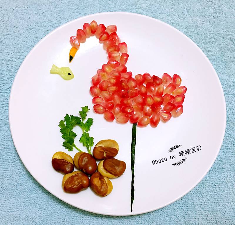 3:石榴摆入盘中摆出火烈鸟的形状用桔皮剪出火烈鸟的嘴巴