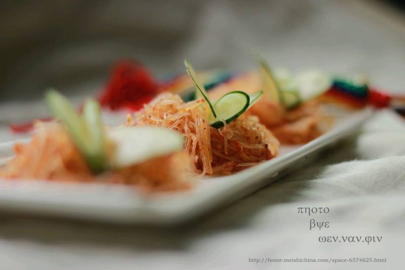 2:锅里放入辣椒,蒜,炒香,再放入粉丝。起锅放入,花椒面。辣椒面。味精。盐。等作料。摆盘。