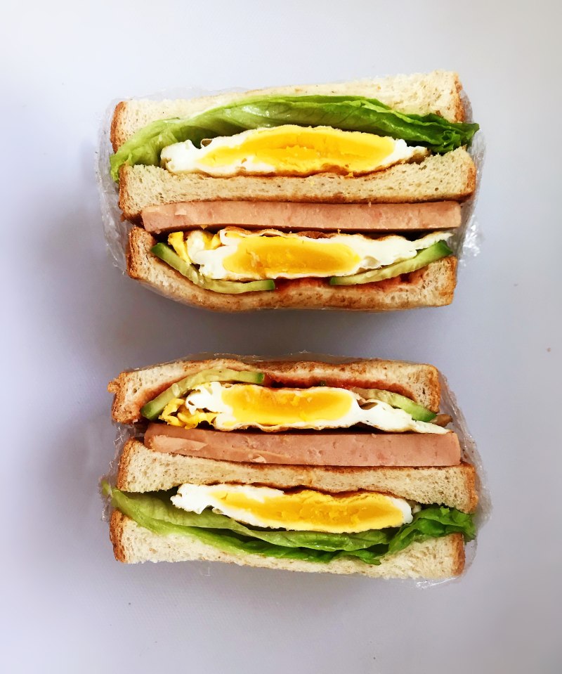 3:三片面包。面包片上抹酱。也可以都抹沙拉酱。餐刀蛮好用。菜、午餐肉、鸡蛋摆在面包片上。