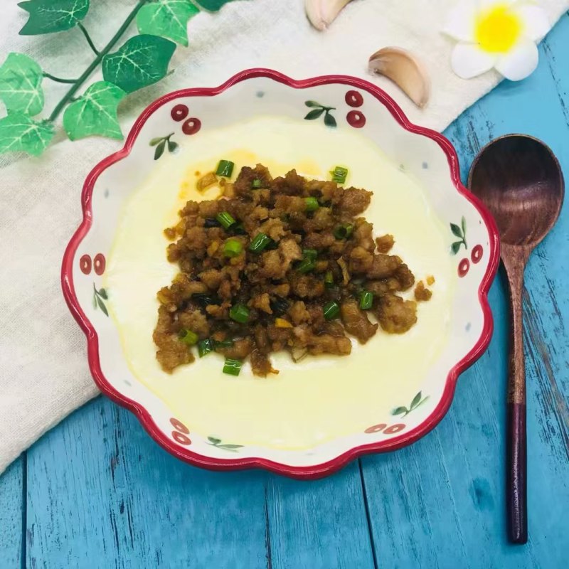 11:将肉末浇入鸡蛋羹表面即可。又香又滑嫩。