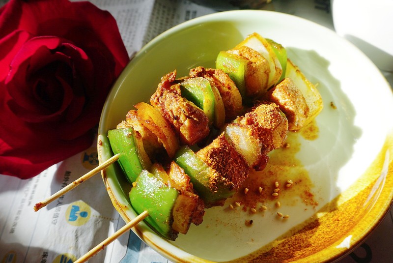 7:肉串煎至颜色金黄后刷点黄豆酱,因为没有甜面酱啦。