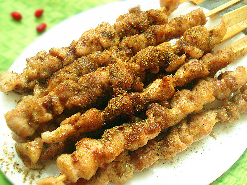 4:锅中倒入少许油,小火,盖上盖子煎鸡肉串,其间注意翻面,撒小料。大约十分钟,关火,焖五分钟即可。
