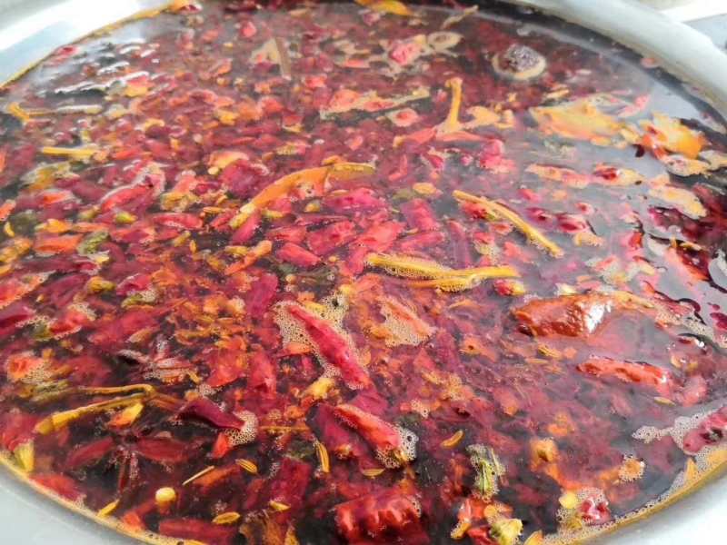 5:第五步继承炒制20分钟左右,放入浸泡的花椒,再炒5-10分钟,锅内原料香气四益时起锅即成串串香底料。