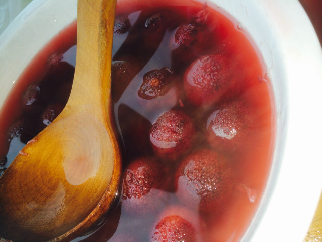 5:剩下的杨梅继续煮,直到汤汁呈现深红色,冰糖完全融化,然后倒入容器中,完全冷却后,密封放入冰箱冷藏;