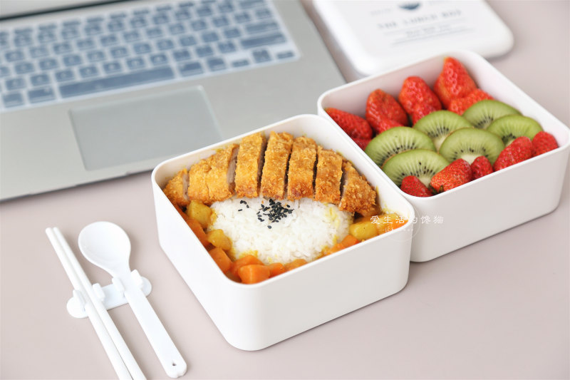 10:用碗装上米饭倒扣放入便当盒里,倒入咖喱菜,在放上切块的猪排,咖喱猪排饭就做好了,全是营养,吃起来超满足!给自己做个营养便当,让上班族的中餐不单调,工作之余,还能够享受美味的午餐时间,给健康的体魄加个油!记得吃饭的时候还要搭配一些新鲜水果,补充身体所需维生素哦!
