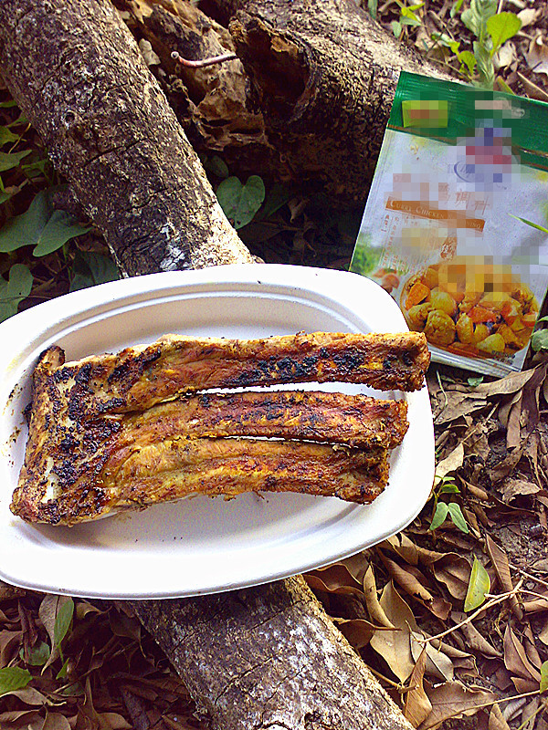 5:烤时边烧边翻动,把腌肉的汁不断扫上猪大排上,以防烧的太干,当猪大排用竹签插入厚肉的地方没有血冒出即可