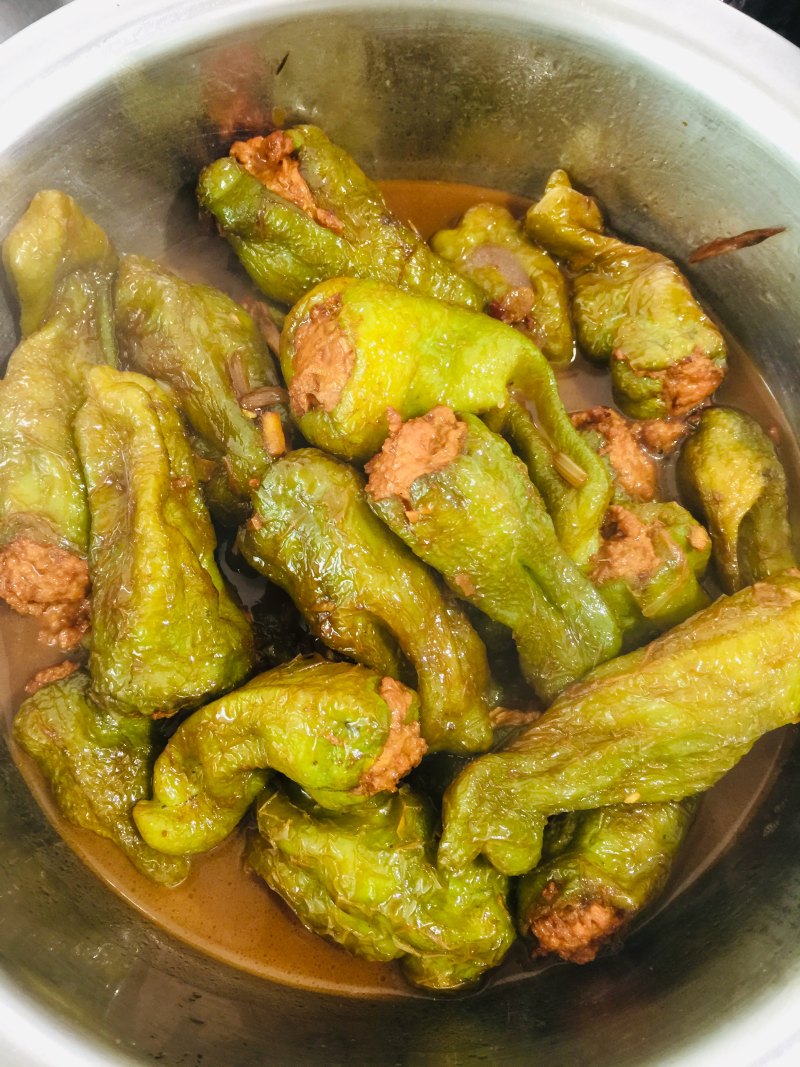 2:青椒洗净去子,把肉灌进去。
