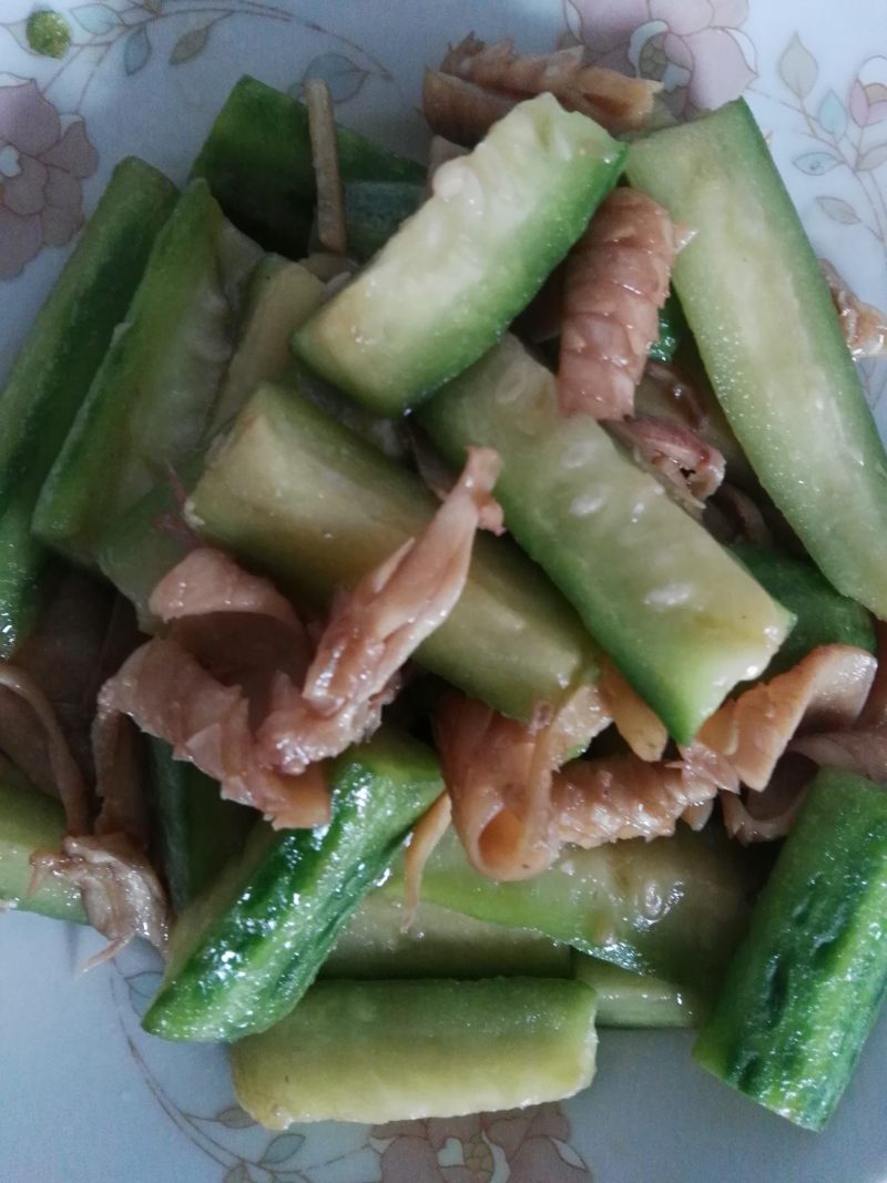 5:尤鱼炒到卷起后把丝瓜放进去,稍炒几下放点盐即可