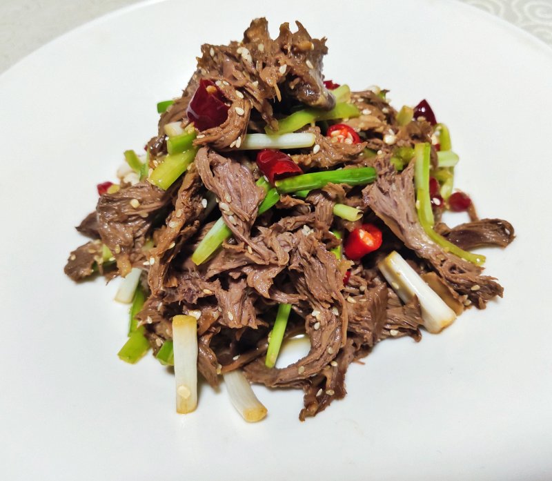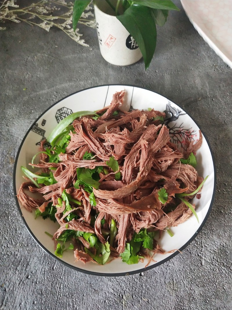 7:卤熟的猪心撕成宽条,加入配料和炝油,放一勺味极鲜、一勺白糖一勺醋拌匀即可。