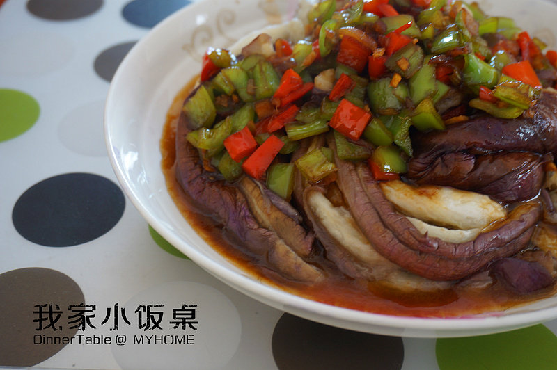 4:蒸好的茄条装盘,大蒜切末,葱切成葱花,和上面说到的各种调料调均浇在茄子上就好了(因为我家有小孩子吃,我把大蒜用小火爆炒了一下去辛辣不然怕伤小孩肠胃)