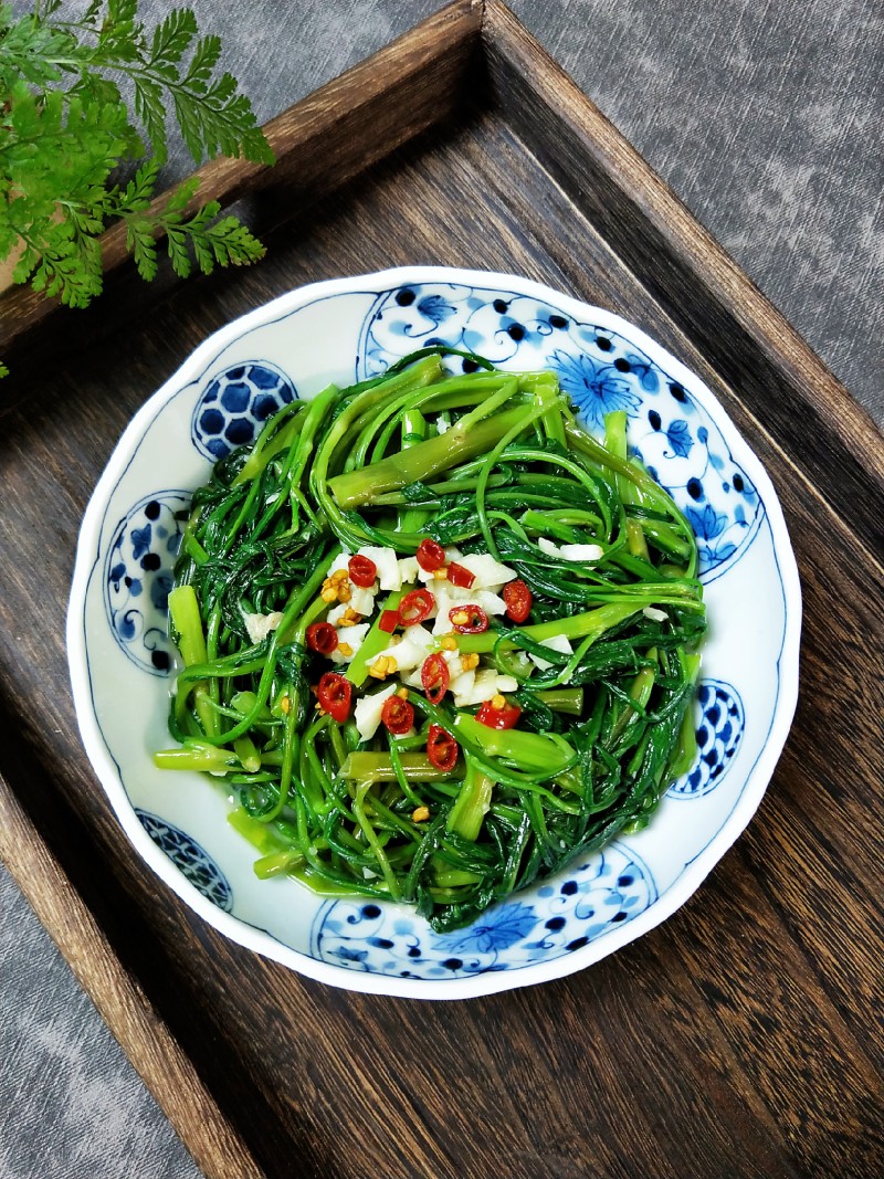 1:空心菜择好,浸泡盐水里半小时,捞出来冲洗干净。