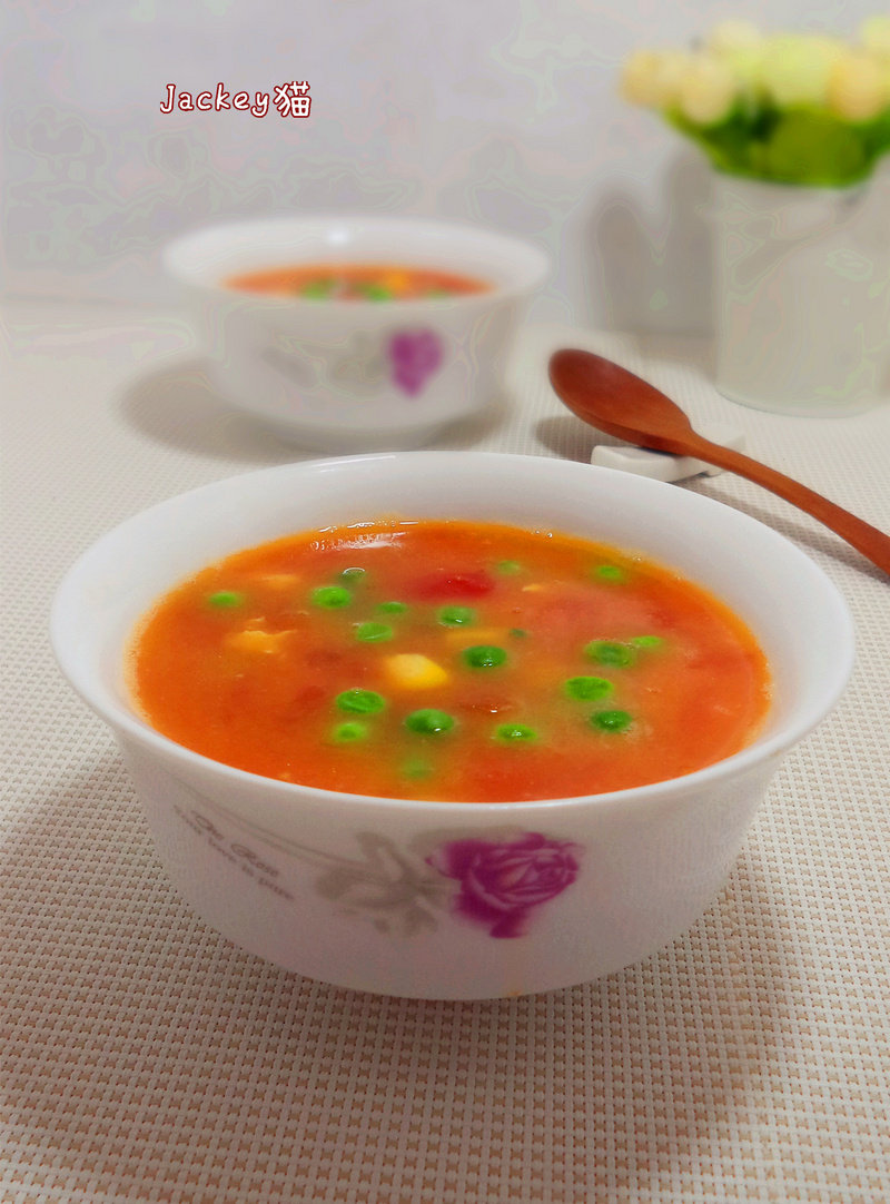 番茄500克;豌豆150克;玉米粒150克;鸡蛋2只;姜葱20克;