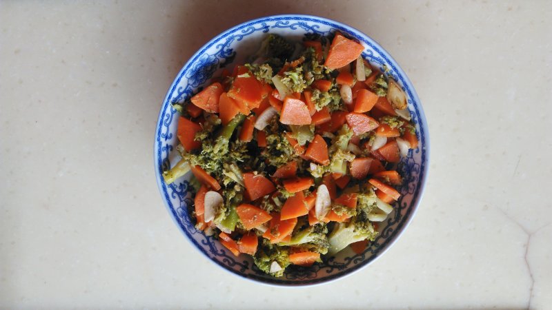1:胡萝卜切块(性质随意啦),西兰花掰成小朵,用盐水浸泡一会;