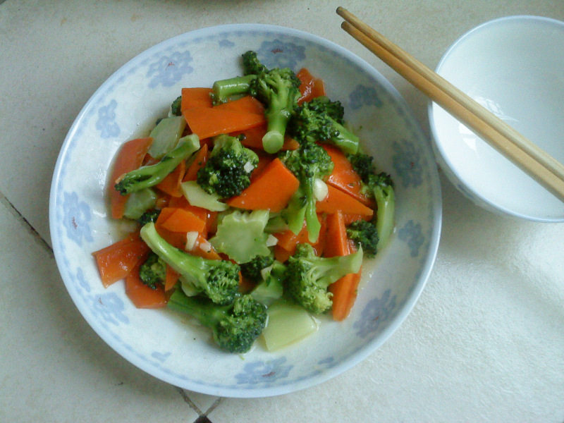 4:先加入胡罗卜翻炒几下,再加入西兰花翻炒均匀,加少许盐调味