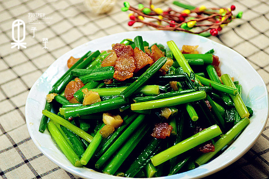 1.韭菜花不需要炒很久,它非常容易熟,颜色变翠绿了基本就熟了~~~2.用五花肉煸出的油脂来炒韭菜花,更香,如果五花肉的油脂太多,可以适当倒出一点,不然炒出来的菜会太油腻。
