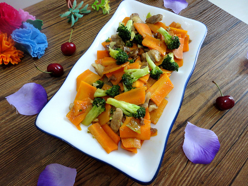 4:放入西兰花和胡萝卜一同翻炒出香味;