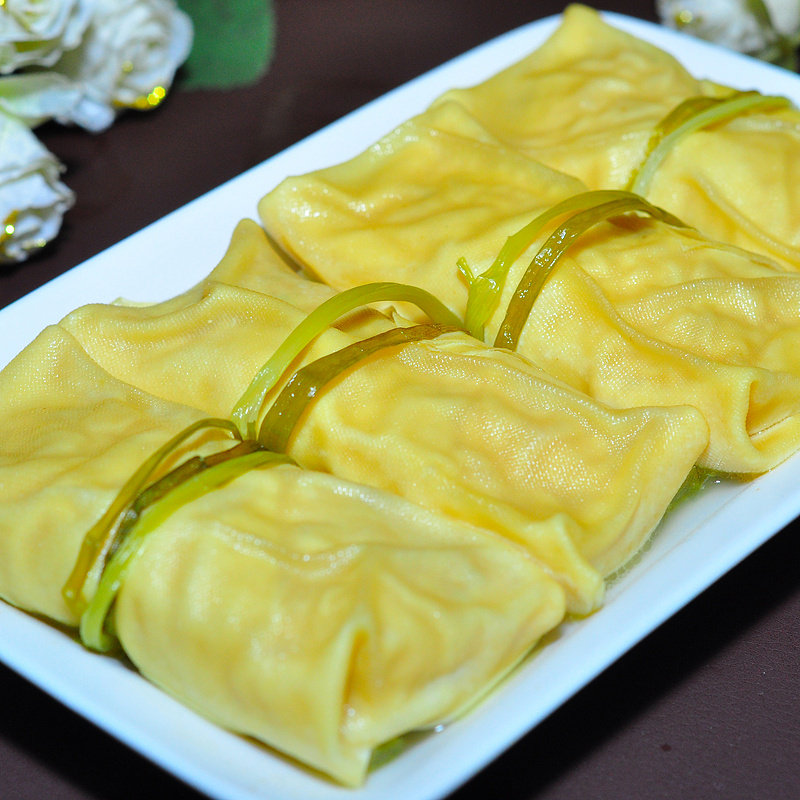 4:将一张薄百叶切成8片正方形,放清水中浸泡变软。