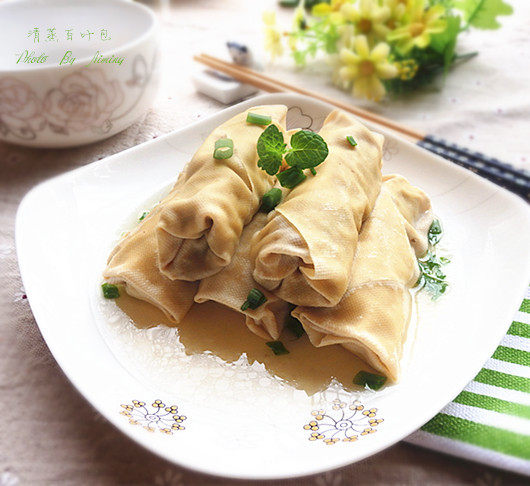 猪肉馅适量;百叶皮适量;鸡汤半碗;葱花适量;