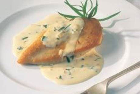 鸡脯4块;面粉2汤匙;冬葱2个;龙蒿4枝;白葡萄酒225毫升;清鸡汤350毫升;鲜奶油4汤匙;
