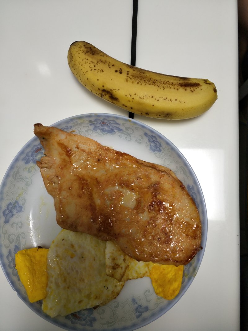 7:放入腌好的鸡脯肉两面煎至熟,我顺带煎了鸡蛋。
