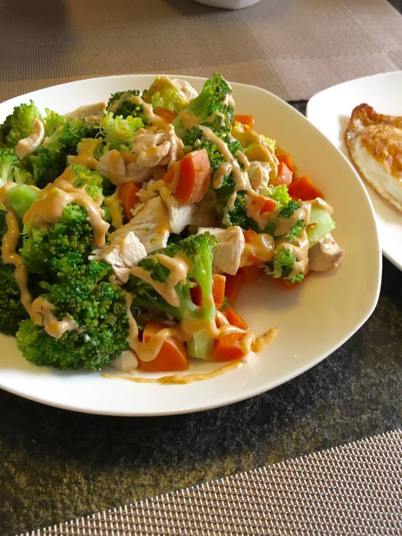 4:煮熟的鸡脯肉切丁和西兰花胡萝卜丁入盘浇上千岛酱完成!