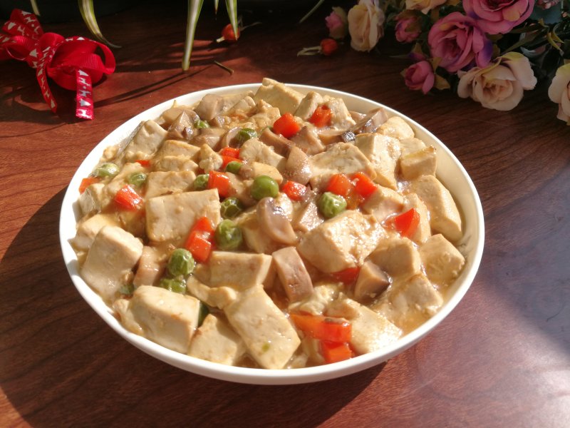 蘑菇适量;豆腐适量;豌豆适量;胡萝卜适量;姜适量;蒜适量;淀粉适量;