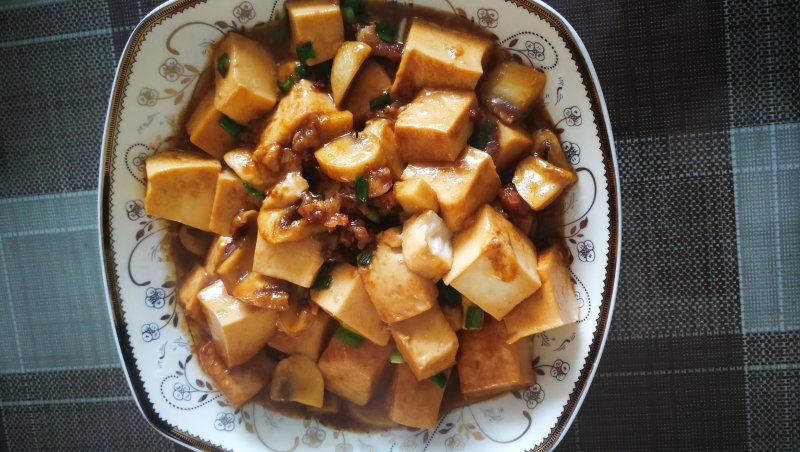 嫩豆腐250g;圆菇3个;碎肉末50g;