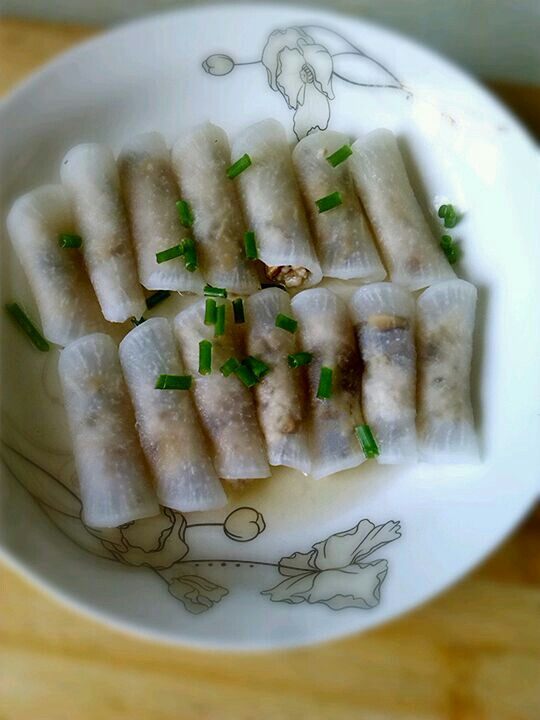 3:萝卜去皮切薄片,入开水中焯软,捞出过冷河