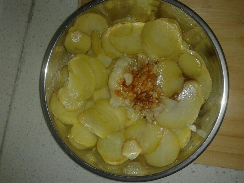 1:土豆洗净去皮切丝放入容器上蒸锅,我是想和芋头一起蒸没有切,我是没有蒸锅就用隔水蒸法了