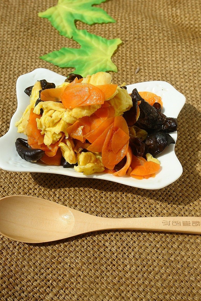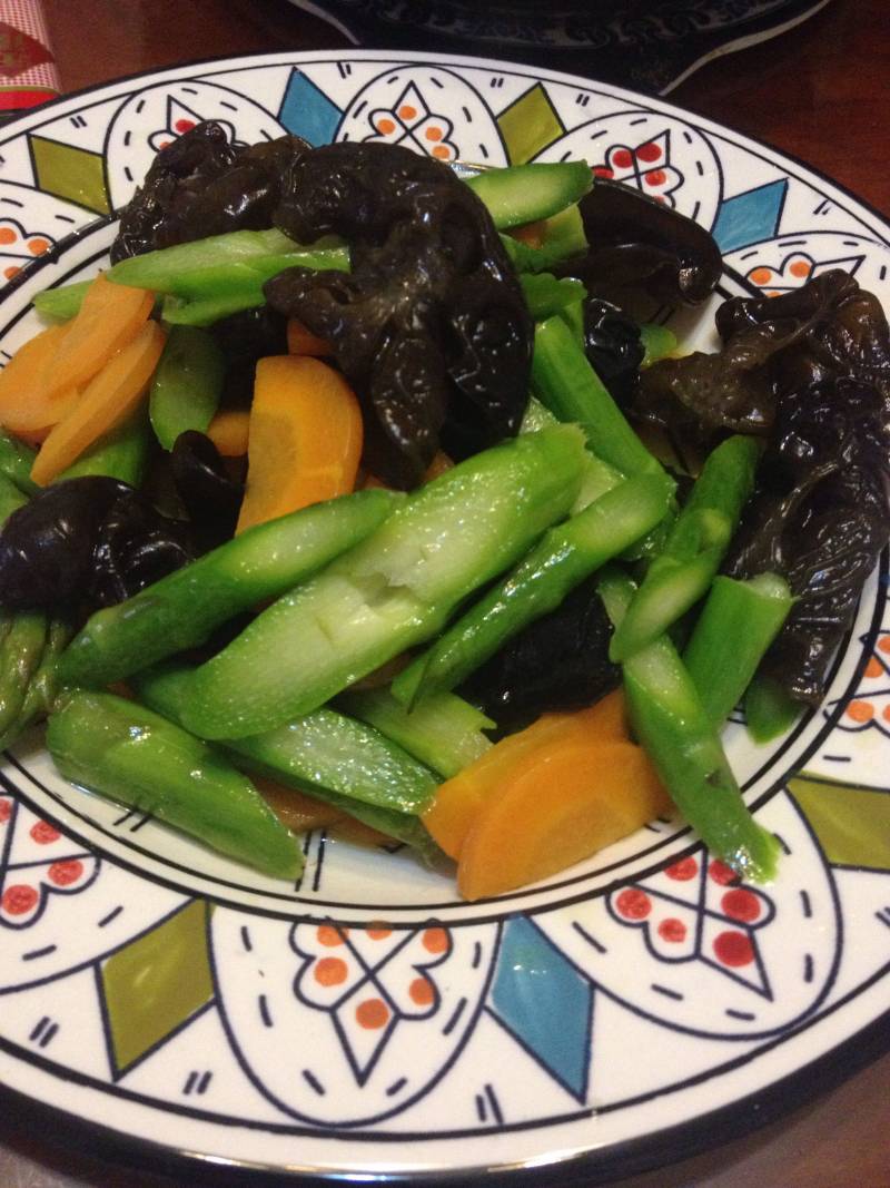 3:再将木耳入水煮熟,沥水后与芦笋、胡萝卜同入油锅快炒,加味精、盐调味即可