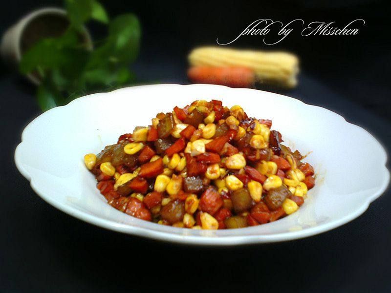2:玉米剥下玉米粒洗净,胡萝卜去皮洗净切丁,大黄瓜去皮去瓤洗净切丁,蒜切碎