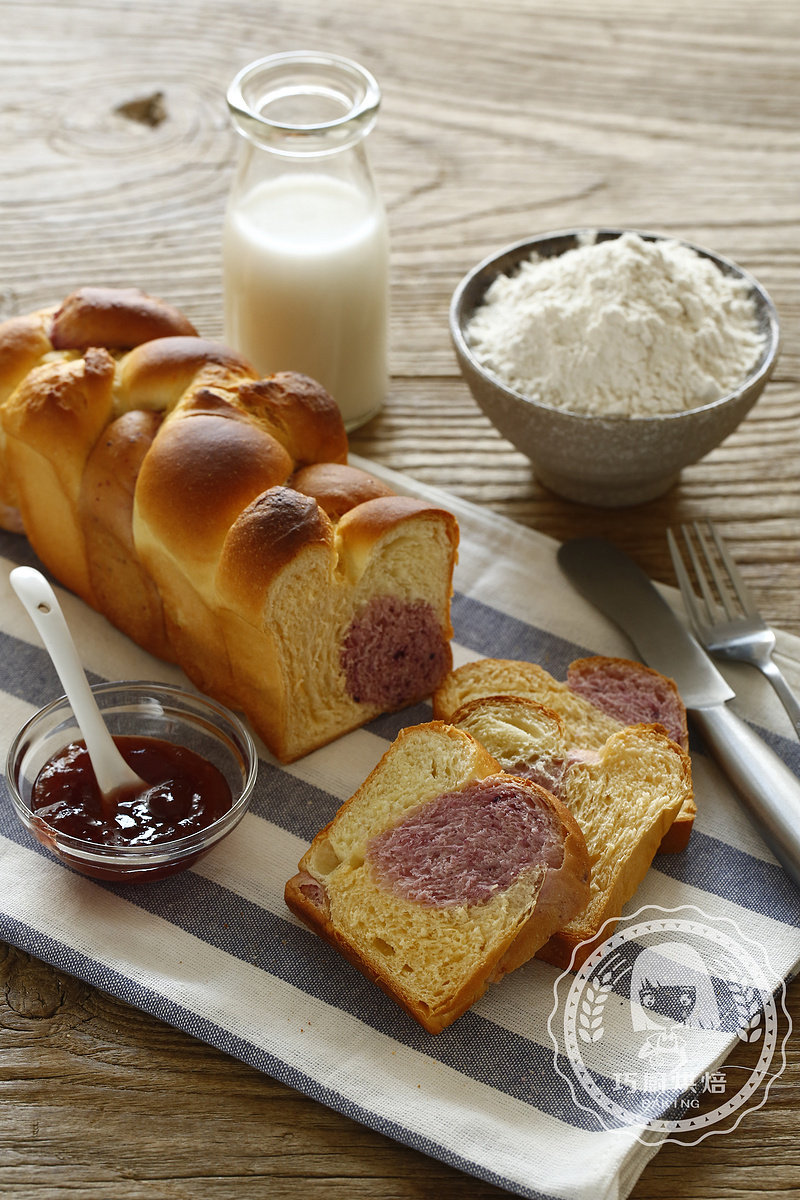 1:材料:展艺面包粉:200克、展艺酵母:4克、奶粉:17克、鸡蛋:1个、黄油:24克、细砂糖:30克、盐:3克、水:50克、芒果果蔬粉:8克、紫薯果蔬粉:8克