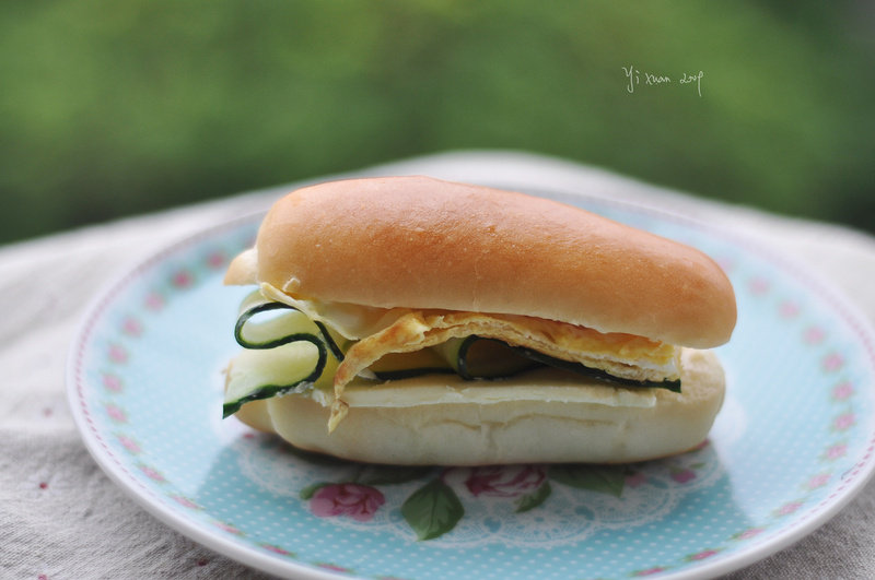 12:夹上鸡蛋和青瓜,挤上沙拉酱,盖上上面的面包即可