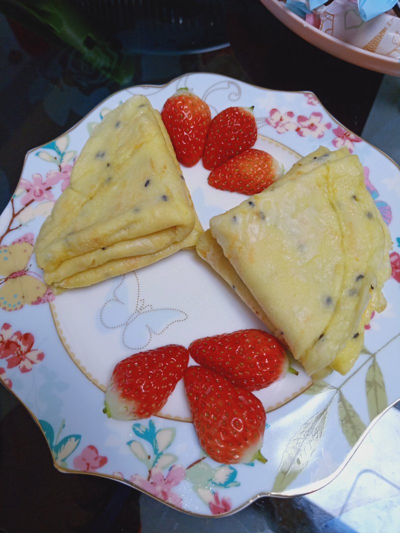 4:锅中刷少许油,倒入一半蛋液摊成饼,卷起来。