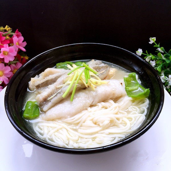 6:另用煮锅将水烧开,将面条稍煮,捞出放入煮好的鱼汤内,小火煮至面条熟软即可。