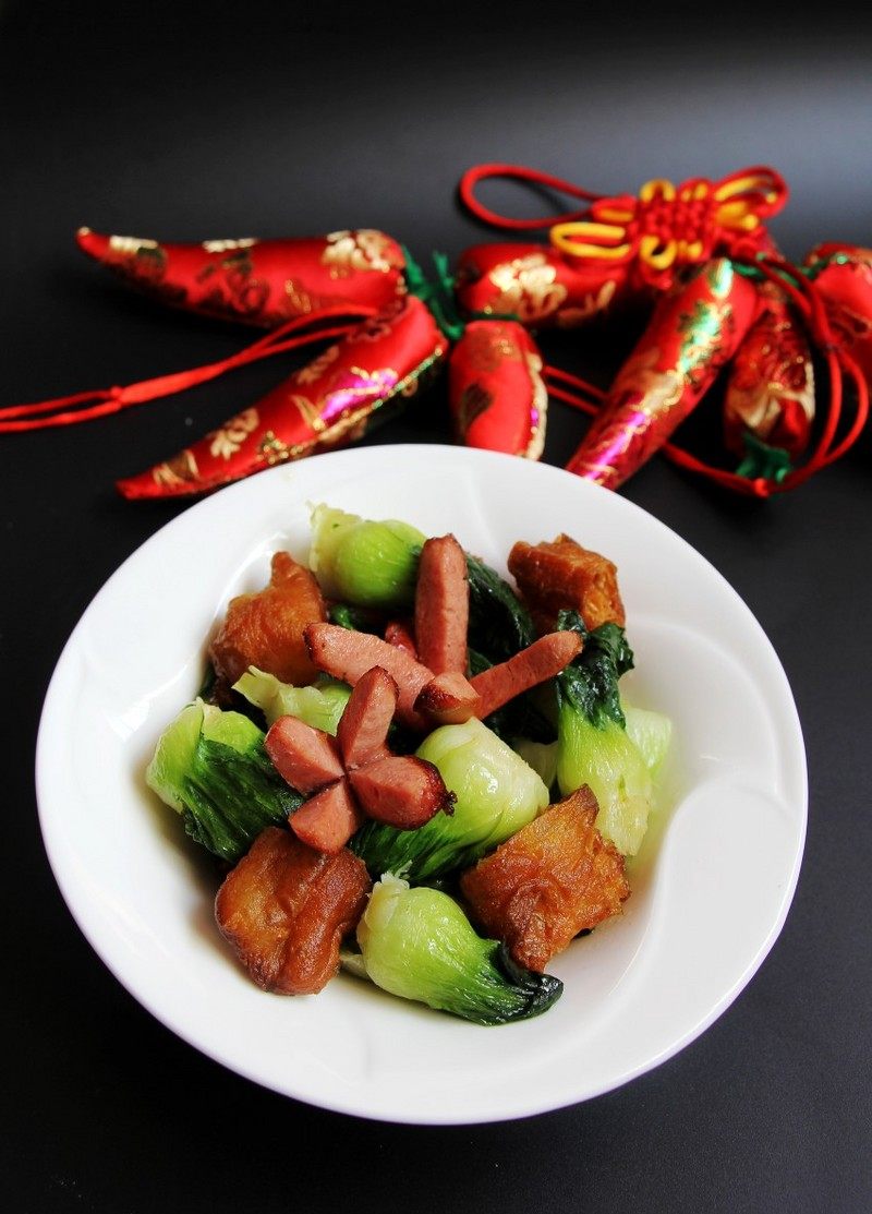 7:炒至青菜软榻后,加入QQ肠。