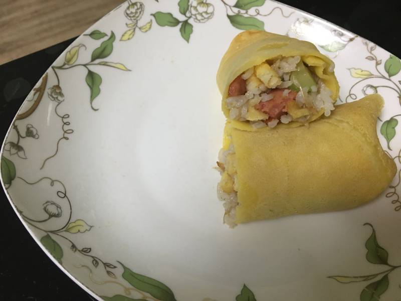 8:把所有食材放到奶皮中间卷起来就可以吃了,我个人比较爱吃薯条所以加了一些薯条放在里边。要喜欢吃其他食材的朋友们也可以加一些别的。