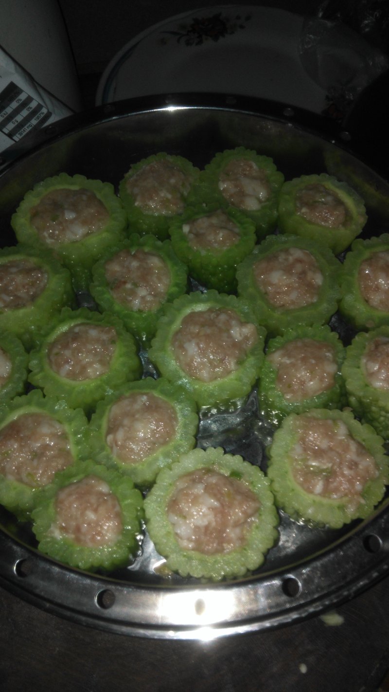 3:肉泥捏团放入苦瓜里,上蒸笼,蒸十五分钟,用苦瓜汁勾芡淋在苦瓜上