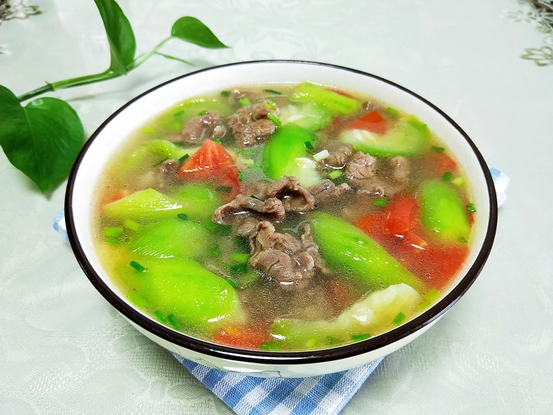 1:准备食材:牛肉、丝瓜、番茄、小葱。