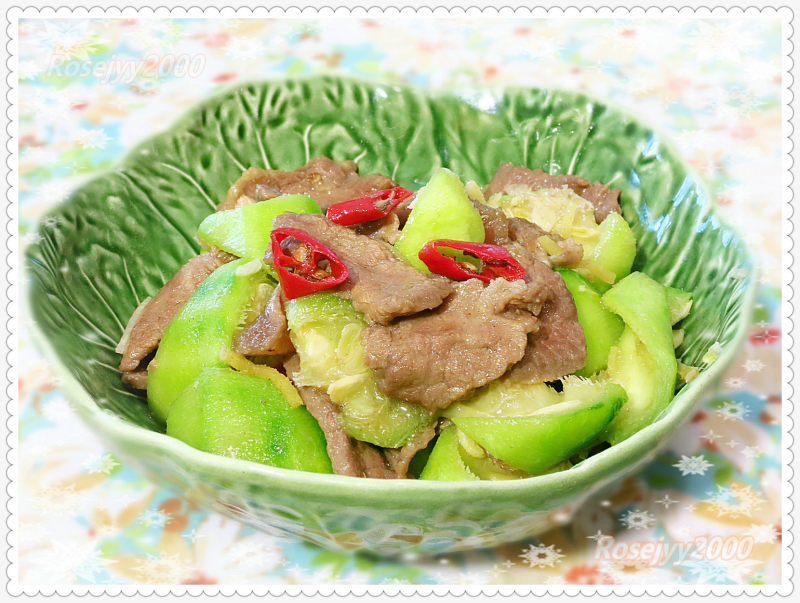 牛肉约100克;丝瓜1条;红椒1只;姜丝1撮;