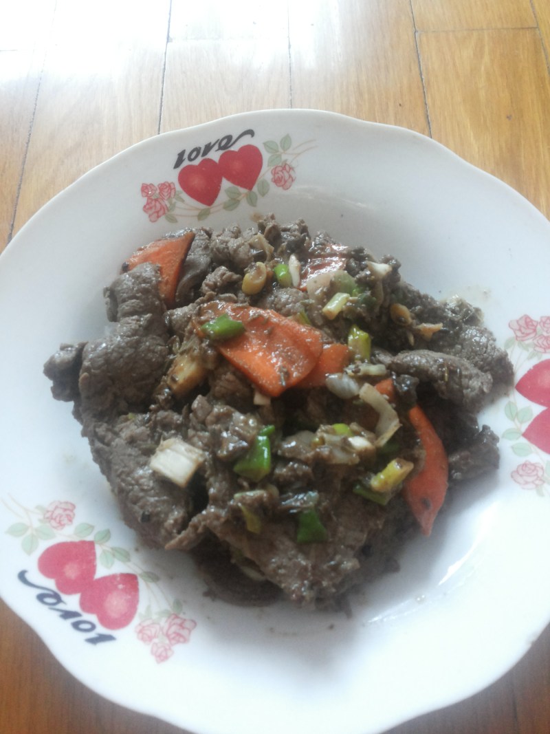 5:炒到牛肉变色,加淀粉炒均匀就可以出锅啦!~