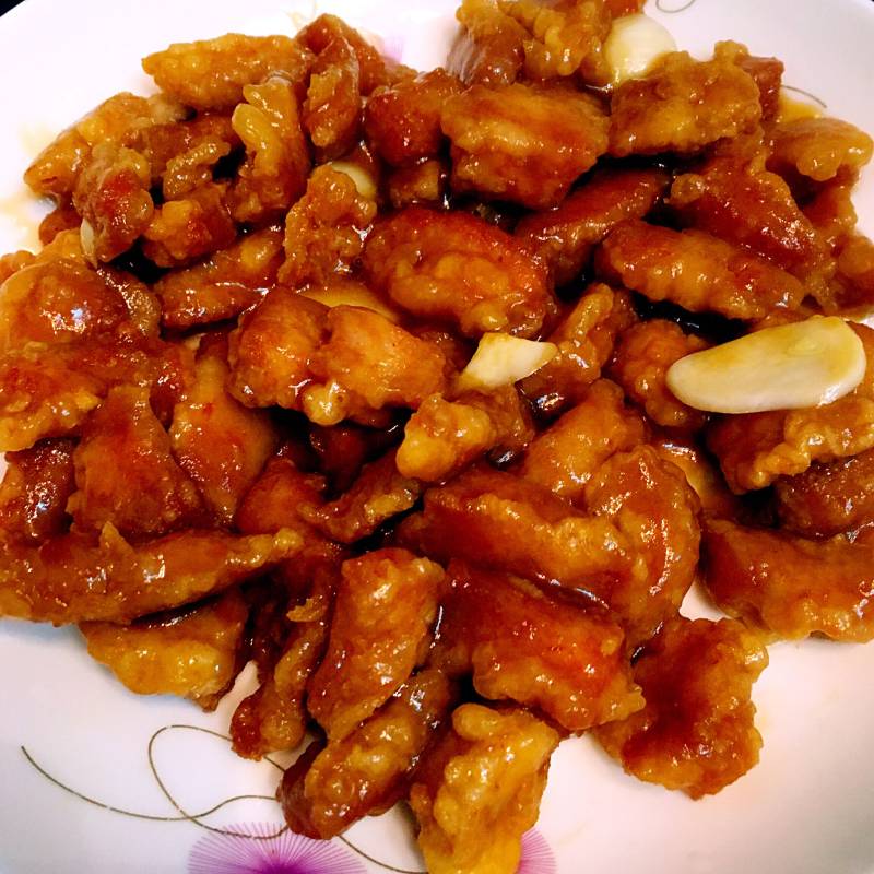 13:金黄色就熟了。现在用一口干净的锅,放入一点油,加热,放入蒜末和兑好的汁,把肉放进去,熬到汁干了,盛盘。