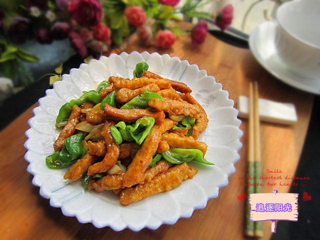 9:放入青椒片和炸制好的肉段,快速翻炒均匀即可