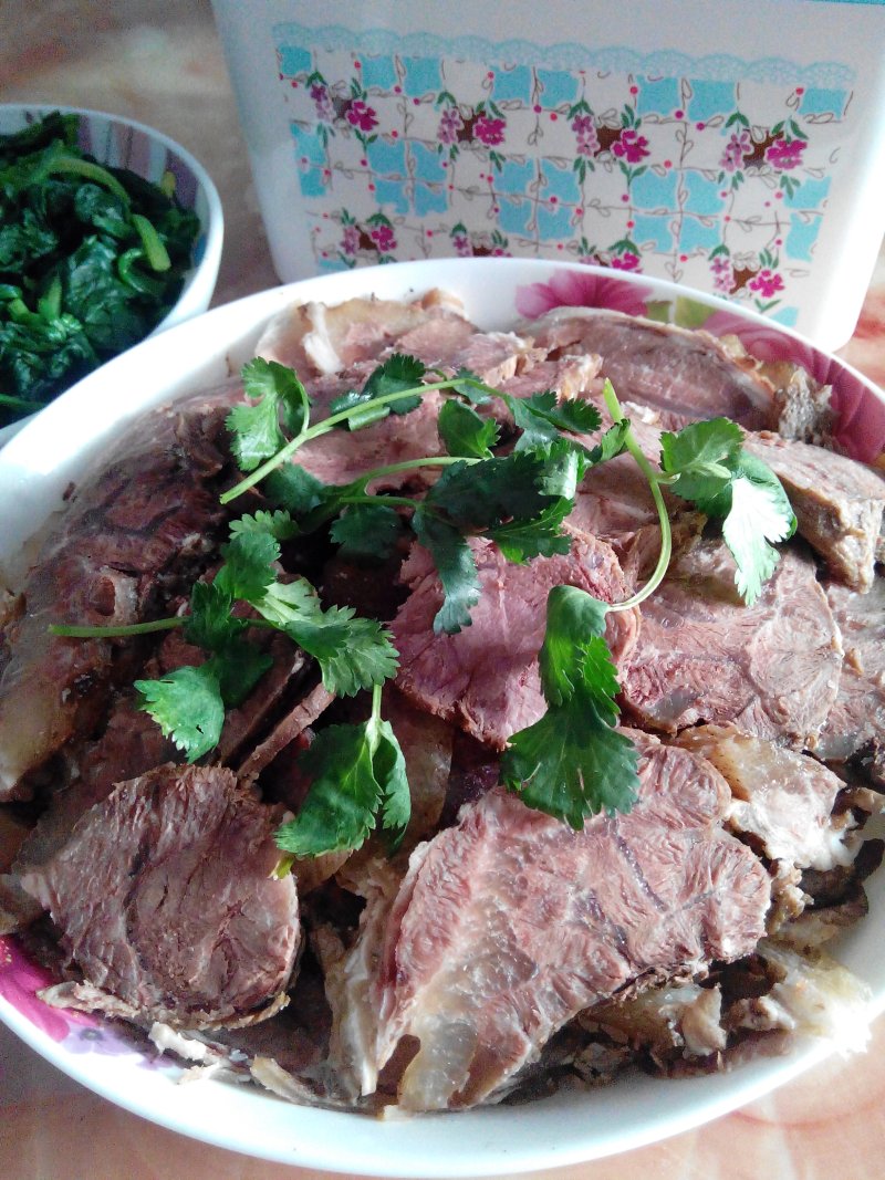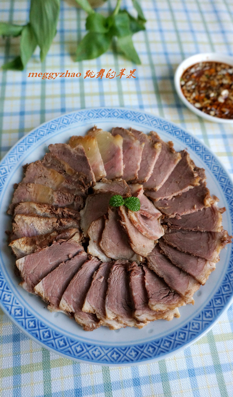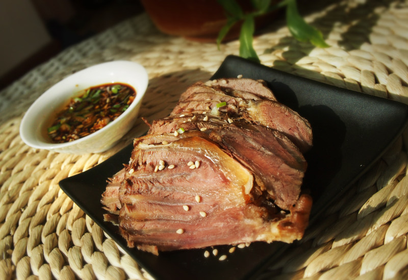 4:牛肉吃的时候切薄薄的片,可以沾辣椒油或者三合油一起吃。