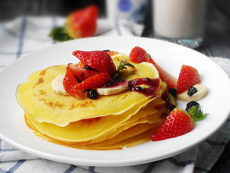 12:每一片松饼间放一些香蕉草莓,放上蓝莓干,再淋上一些蓝莓果酱就可以了。