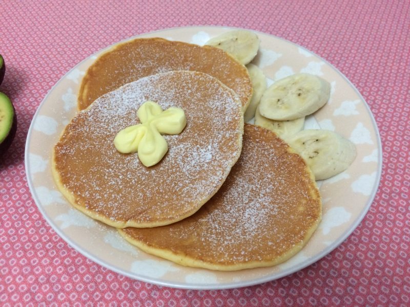 5:平底不粘锅放油烧热,舀一勺面糊倒入锅中,小火慢煎。面糊稍凝固后关火等一分钟,(有糖分的东西容易糊锅,关火用余热让饼更均匀地受热,也可以让饼更松)翻面再小心煎到金黄。