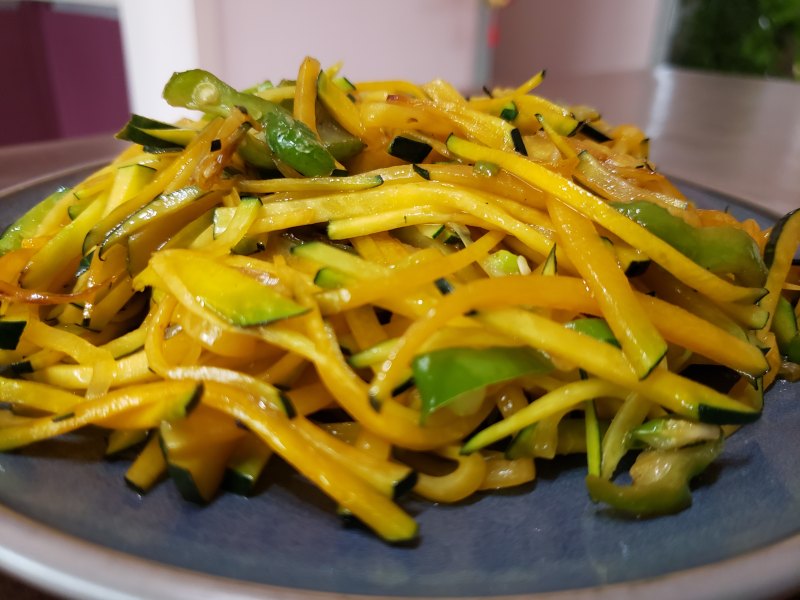 3:锅烧热放适量油,倒入青椒炒香,再倒入南瓜丝加适量盐、醋和五香粉调味,翻炒几下即可。