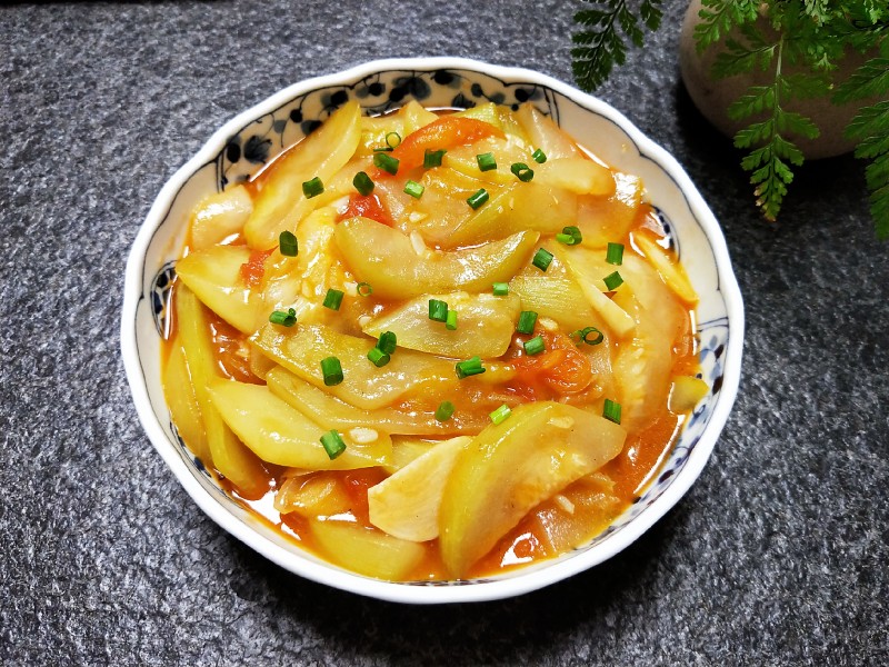 3:瓠瓜切片,番茄切块,葱蒜切片。