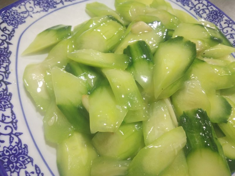 3:净锅放色拉油少许烧热下蒜片丝瓜黄瓜迅速调味勾芡上火反超几下起锅。